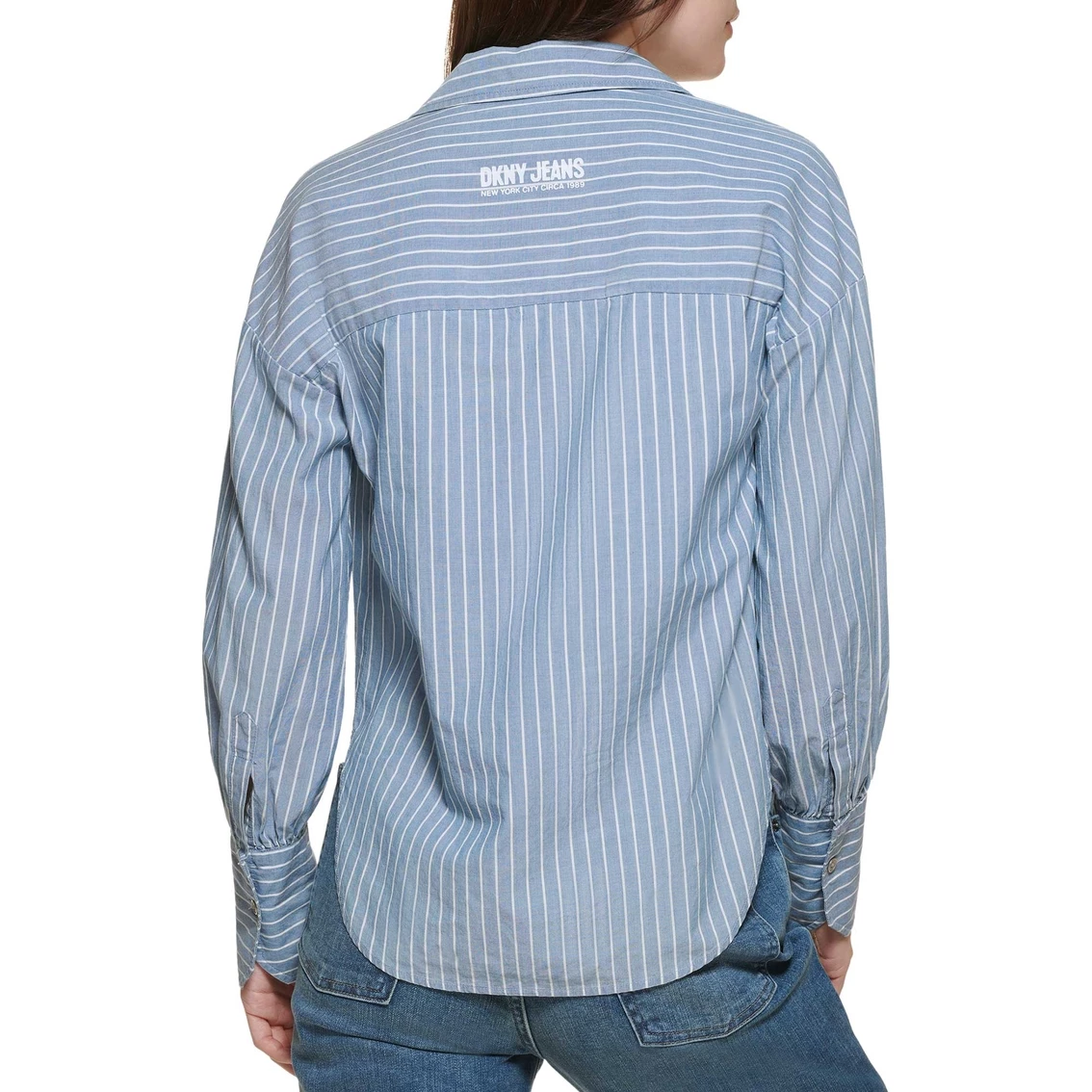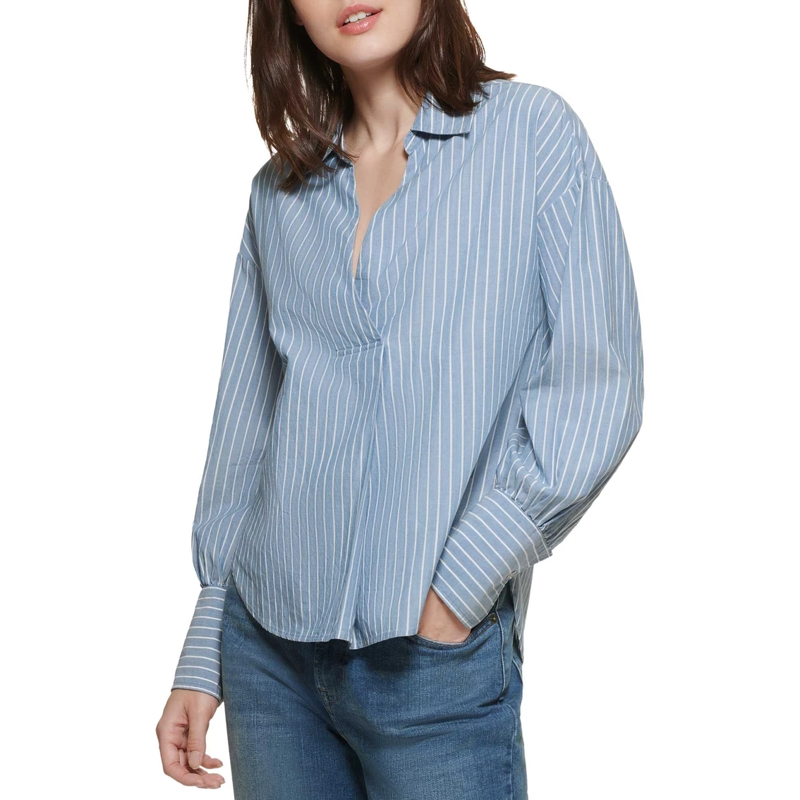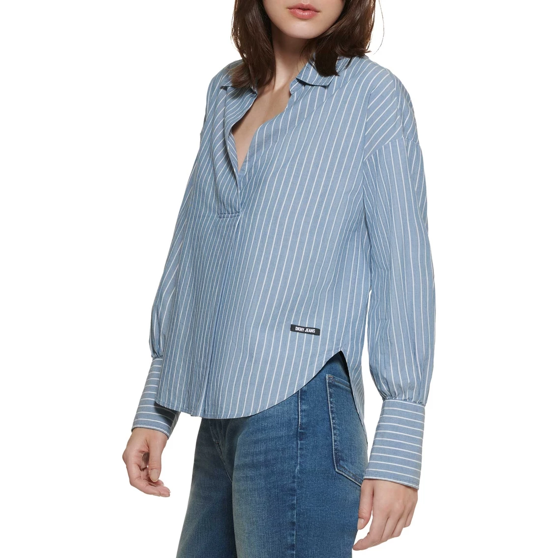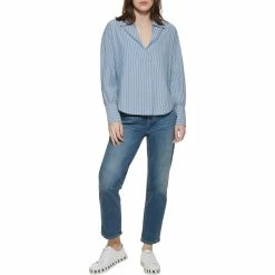 This woven top from DKNY is finished with long sleeves, a collared v-neckline and vertical stripes. It is a classic comfortable silhouette. It is flattering for all body types.