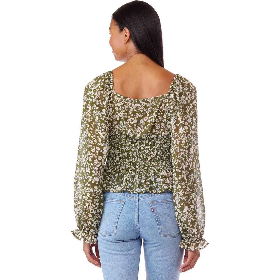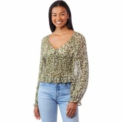 Watch your style blossom before your very eyes in this fun, floral top from Ever After. Top features a tie front detail, long sleeves with a ruffle hem and a smocked bodice for the perfect fit. Style: 1082J.