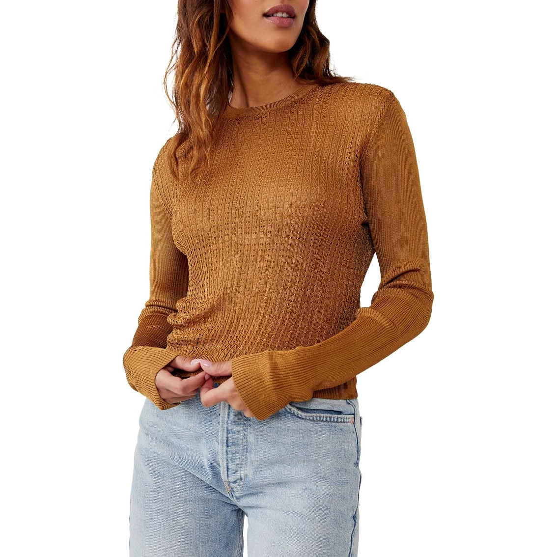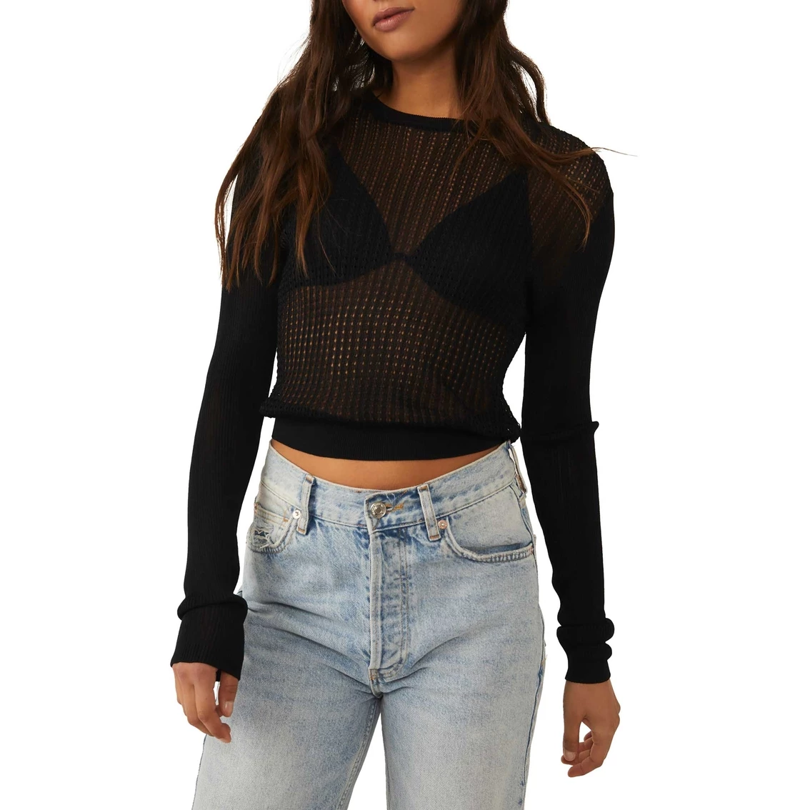 From Free People add effortless edge to any look with this forever essential pullover featured in a staple silhouette with sheer, mesh-inspired piecing at center and contrast sleeves for added dimension.