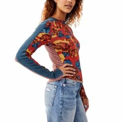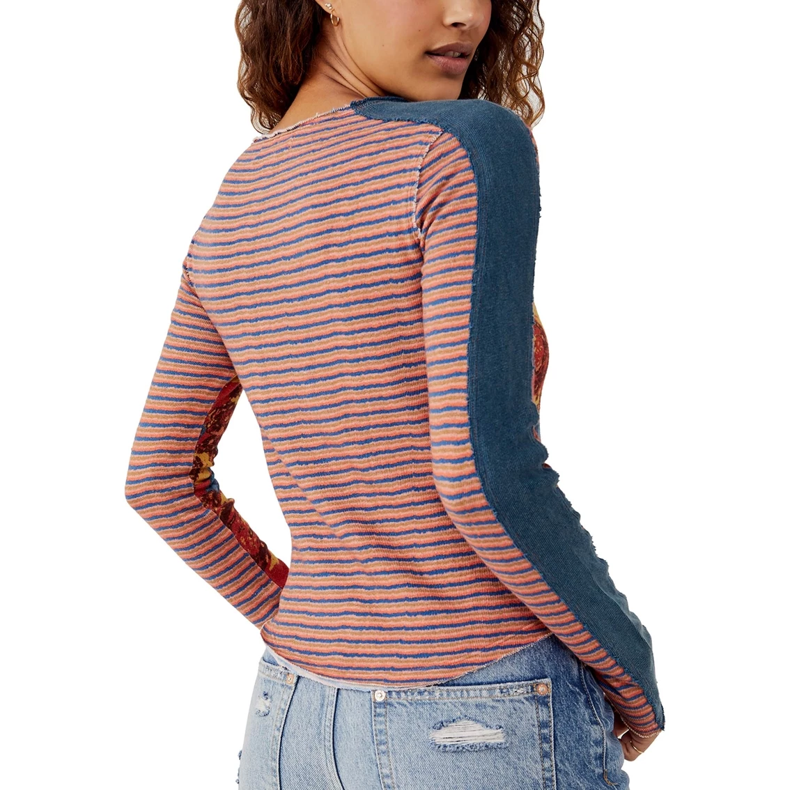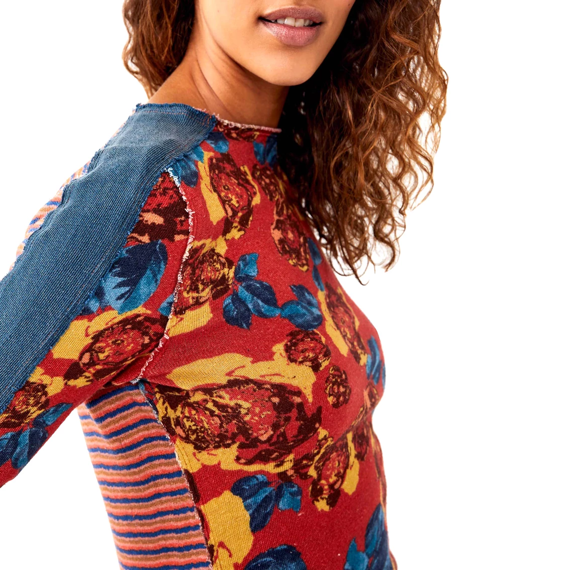 From Free People this top features a mash up of multiple prints and solid with raw hem detailing. Style: OB1533679641.