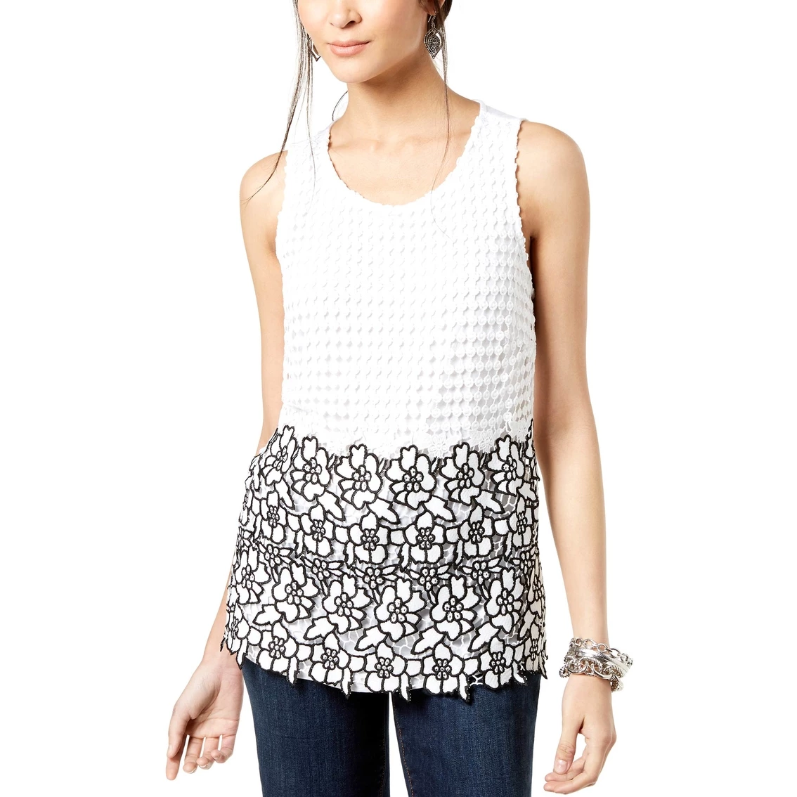 INC International Concepts’ petite top sets itself apart with colorblocked lace in a duo of pretty patterns at the front. Features scoop neckline back keyhole and button closure. Lace overlay at front; colorblocked floral lace at bottom front. Hits at hip. Style: A100021167P.