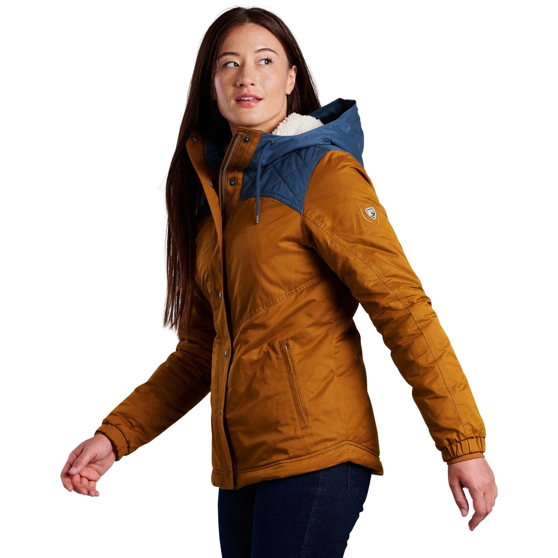 Elevate your outdoor adventure with the Kuhl Celeste Lined Hoody. Feminine, mountain-born style crafted with a durable wax-coated exterior for rugged protection against wind and water. A luxurious Italian fleece lining provides cozy warmth and the ultimate in winter comfort. Oversized, zippered handwarmer pockets and an interior security pocket keep valuables protected. Style: 2193507.