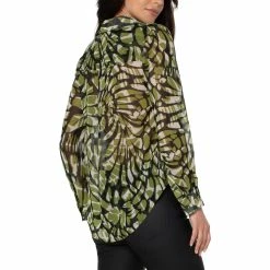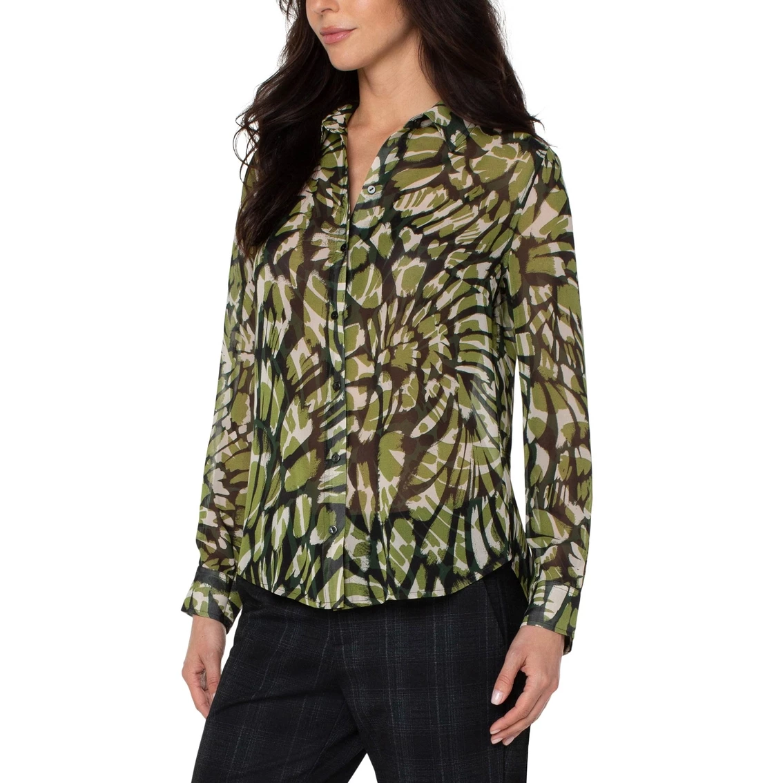 Shades of green blend together in this chiffon button-up blouse from Liverpool. It has long sleeves and a button-up front design with collar. Style: LM8543HD4P31.