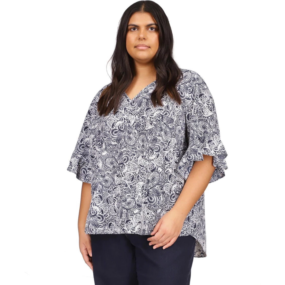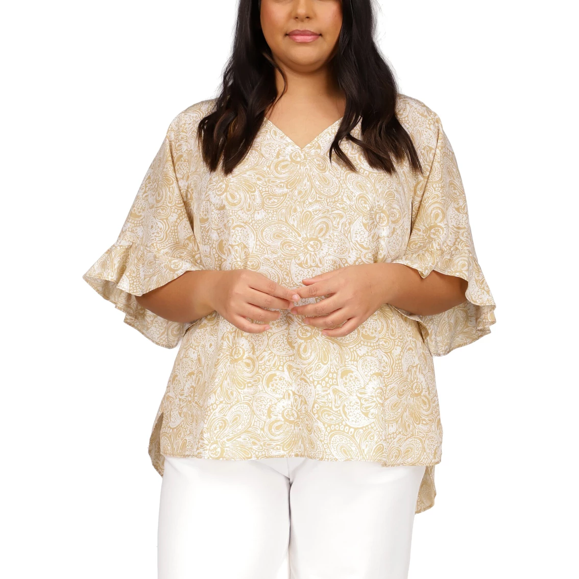 This paisley print plus size top by Michael Kors boasts statement ruffle details for a trendy look. This top features three-quarter sleeves. Pair this detailed top with a variety of bottoms, from skirts to jeans. Style: WU240D962L250.