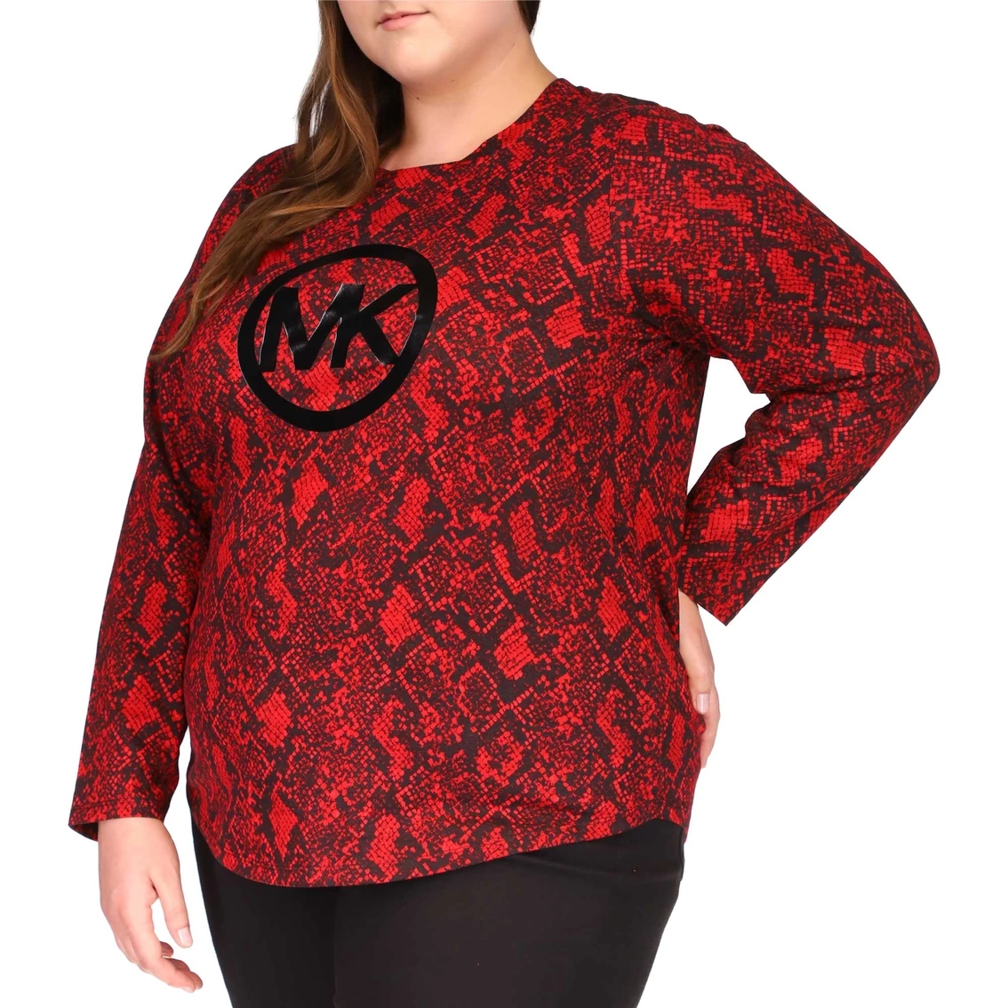 Try on this Michael Kors Plus Size Snake Logo Tee. Styled with an edgy snake allover print, this long sleeve tee features the iconic MK circle logo for a look you’ll want to wear every day of the week. Style: