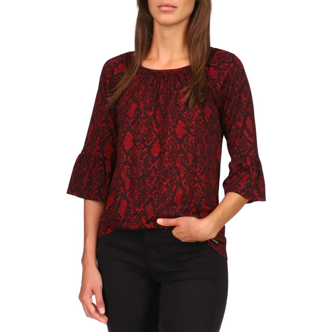 Cool python print decorates this Michael Kors top, featuring flare sleeves and a whole lot of chicness. Made of a cotton and modal blend fabric, this 3/4 sleeve top is not only comfortable, but stretchy and breathable. Style: MH15LGA4AD.
