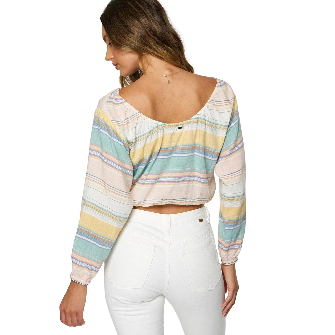 Easy and stylish is this O’Neill Women’s Mallie long sleeve woven top. This is a long sleeve woven top that has a blouson sleeve design with a stripe print. Has encased elastic at neckline and hems. Will look super cute with jeans or shorts! Style: SP2404016MUL.