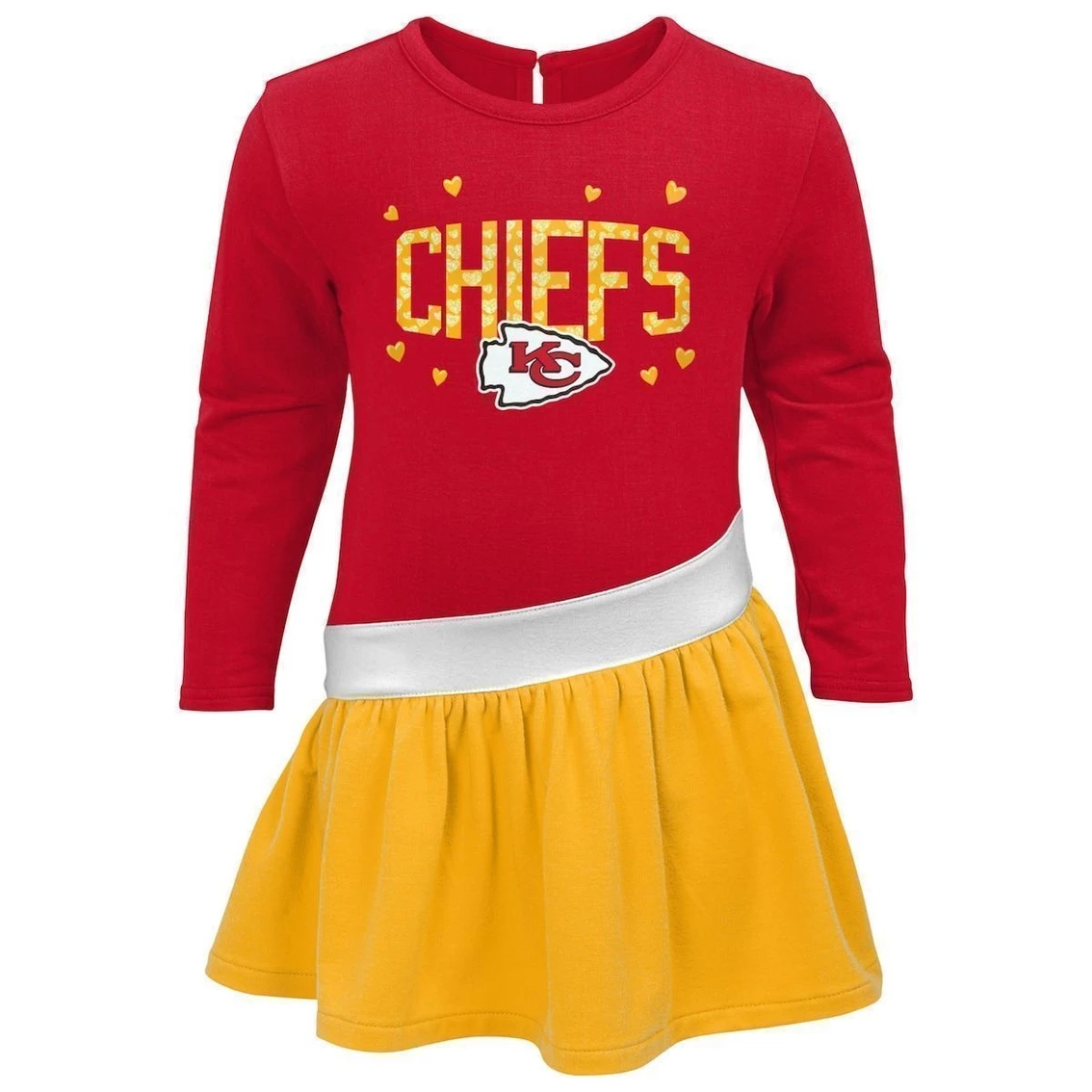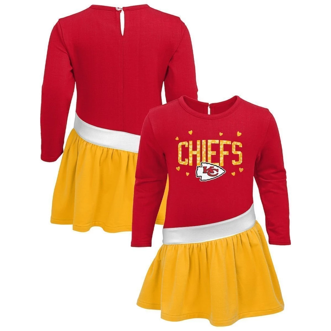- Prepare your little one for game day in true Kansas City Chiefs fashion with this adorable Heart to Heart Jersey dress. It’s designed with lovable Kansas City Chiefs graphics and plenty of hearts, so everyone can see which squad your fam roots for. Not to mention, the extra-soft tri-blend material is sure to keep your youngster comfortable.