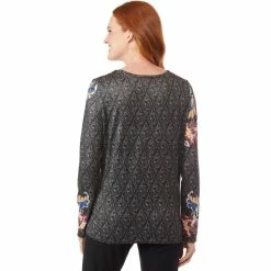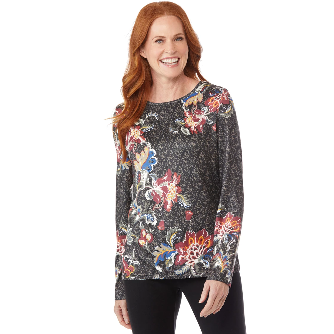 You’ll look fantastic in this Passports Crew Neck Floral Print Knit Top. This long sleeve crew neck hacci fabric knit top has a black ground with a multi floral print. Made of machine washable polyester spandex. Wherever you’re going get there in style with Passports. Style: T36634A.