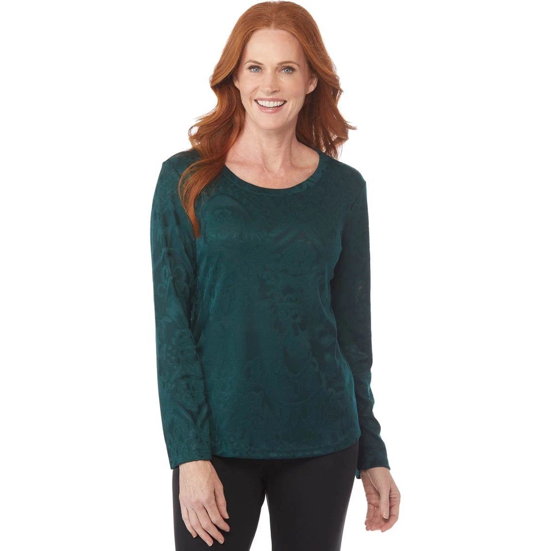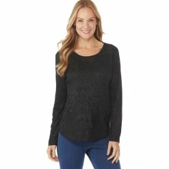 A comfortable, stylish women’s top from Passports. You’re going to love this fashionable long sleeve, crew neck, curved bottom hem jacquard knit top. Solid color. Dress up or down, perfect for work or a casual cool night out. Polyester/rayon/spandex blend fabric. Machine wash. Style: T5414VQDA.