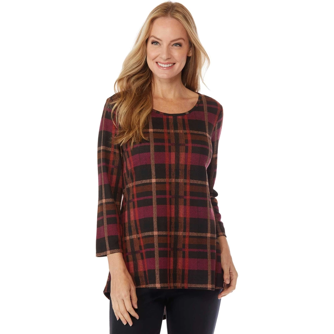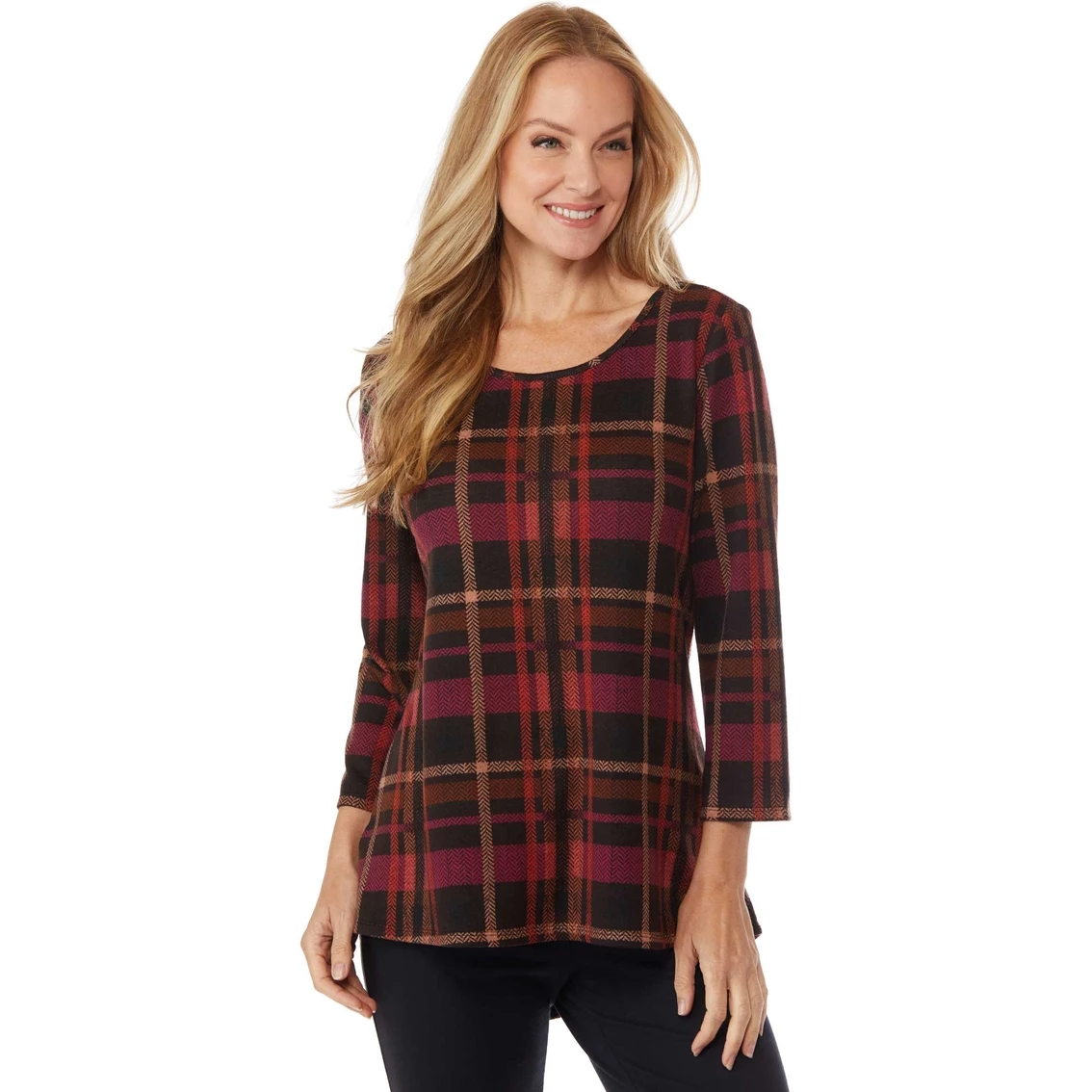 Go mad for plaid in this cute tunic from Passports. Top features three-quarter-length sleeves, pullover styling and plaid pattern. Machine wash cold, gentle cycle, lay flat to dry and cool iron as needed. Style: SL121751AF.