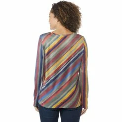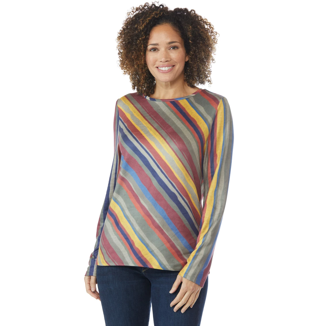 Crafted from polyester, spandex and hacci fabric this knit top from Passports can be dressed up or down. Top features long sleeves, a crew neckline and asymmetrical multi-stripe print. Machine washable for easy care. Style: T36633A.