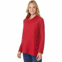 The Passports Textured Fabric Cowl Neck Side Button Top features textured fabric for comfort with a long sleeve cowl neck design. Machine washable for easy care. Non-functional side button. Style: PPF20904F22A.