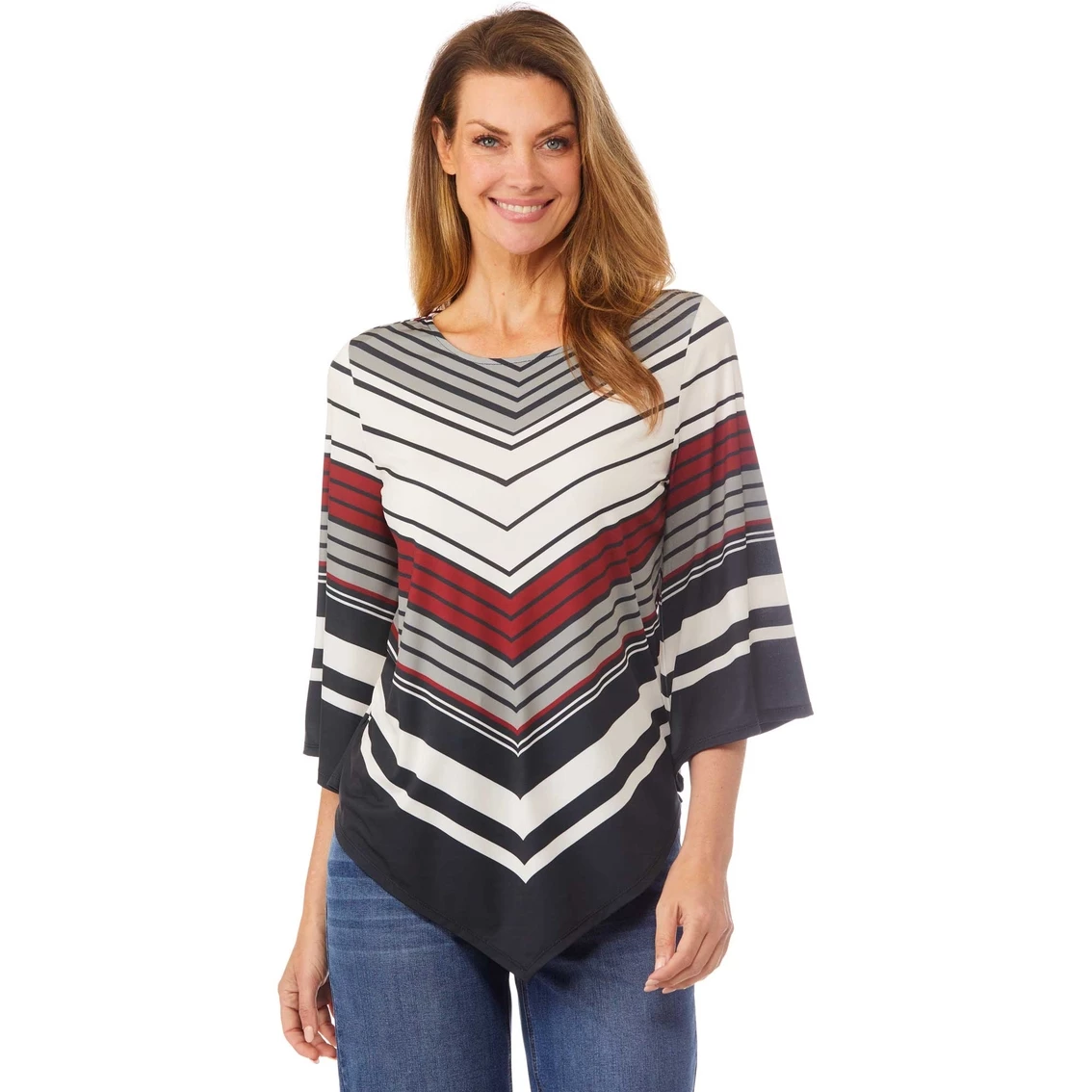 Make a statement with the Passports Three Quarter Sleeve Chevron Print Knit Top.