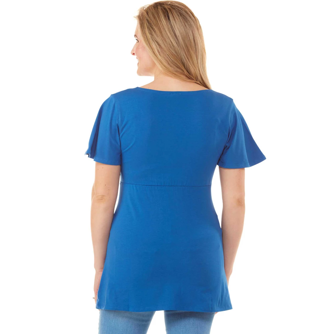 Mommy to be will feel cute and comfy in this Planet Motherhood Flutter Sleeve Faux Wrap Top. Made with short sleeves, it features an empire waisted faux wrap. The top is made from rayon and spandex. Machine wash for easy care. Style: J7498-BLU.