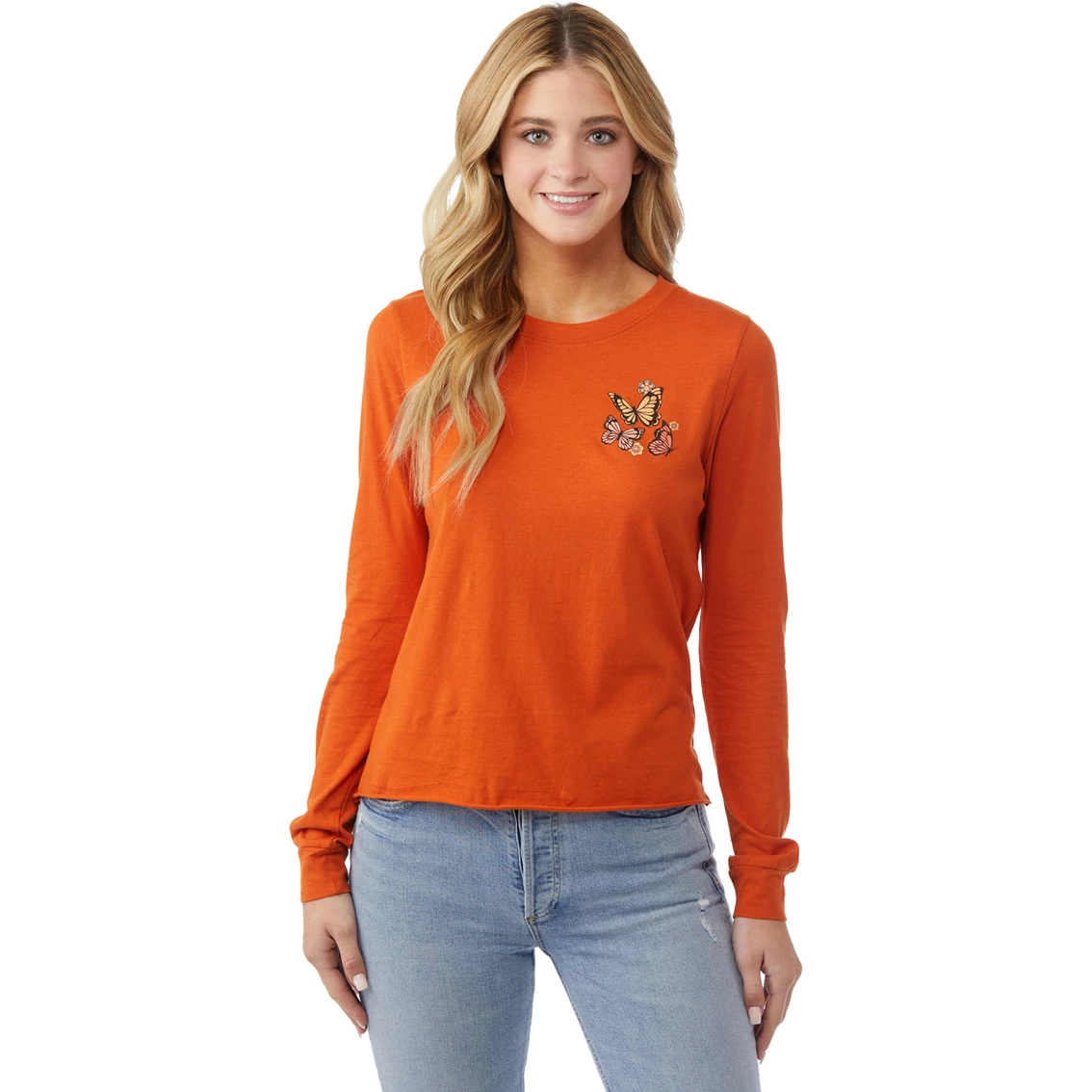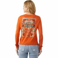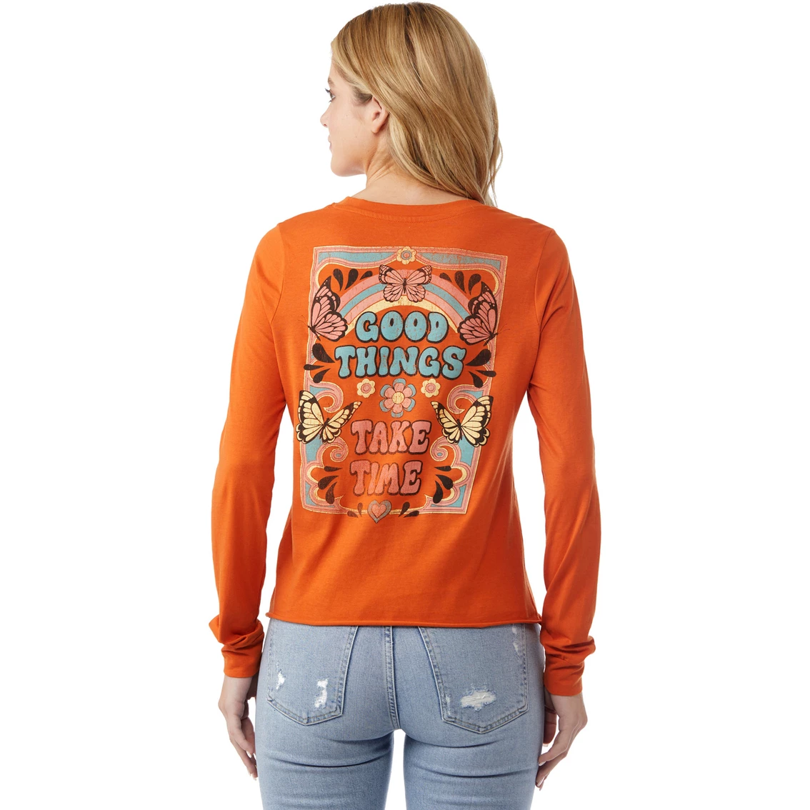 Stay groovy in this rust long sleeve Rebellious One Good Things Tee featuring Good things take time verbiage. Style: B1440JX2814RUST.