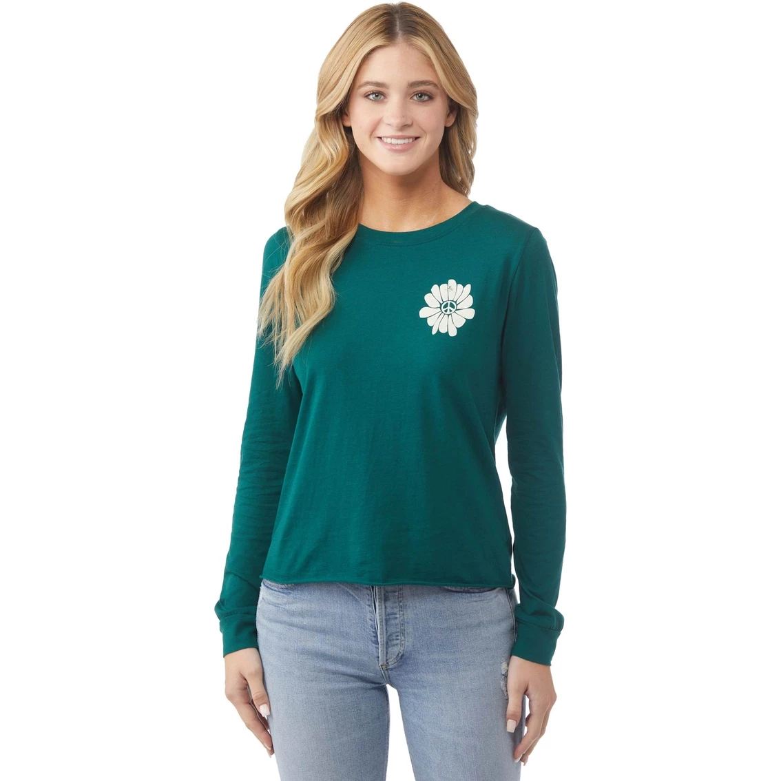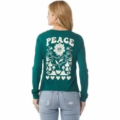 Keep on being cool in this green long sleeve tee featuring Daisy Peace front and back. Made of cotton, this Rebellious One Juniors Tee is just your style. A great casual top for anytime. Style: B1440JX2783GRN.