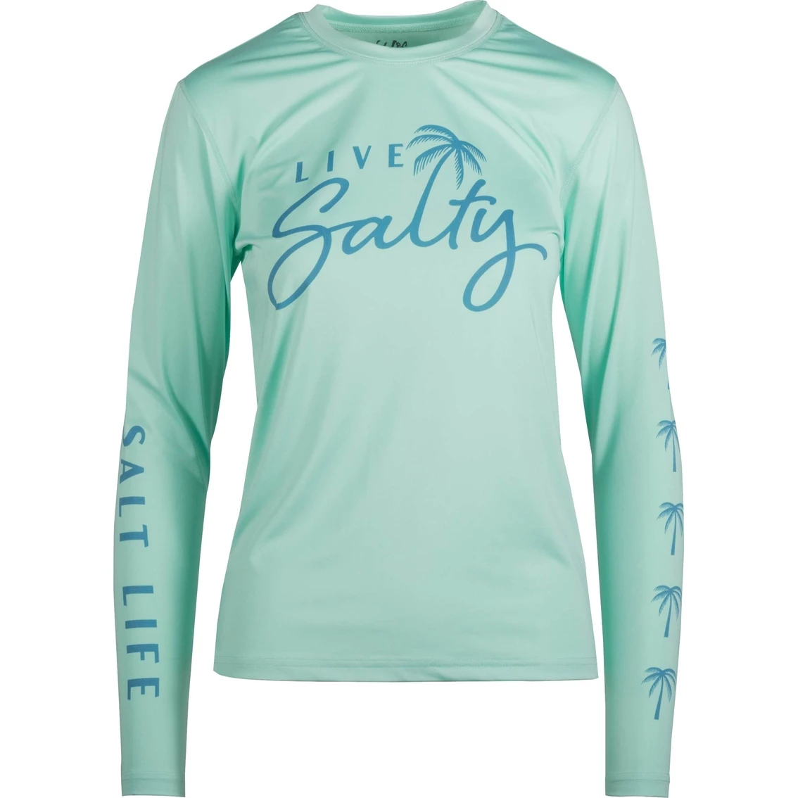 The Palm Breeze Aquashirt From Salt Life is a long sleeve rash guard tee is a great addition to your wardrobe! Tee features premium 4-way stretch fabric for water performance and sun protection, UPF 50, back logo heat transfer and front and sleeve screen print logos. Available in three different colors, this long sleeve Salt Life T-shirt is the perfect performance tee for water sports, sun protection and layering during transitioning weather. Style: SLJ713316.