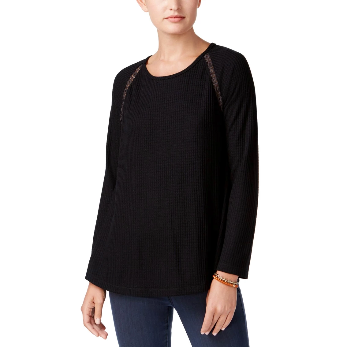 Casual waffle-knit gets an update with lovely crochet covering the upper back of this petite Style & Co top. Scoop neckline. Crochet trim at back yoke and front shoulders; waffle knit. Relaxed fit; hits at hip. Designed to fit and flatter 5’4″ and under frame. Styles are tailored for the petite customer, hits and fits at the right places specifically at wrist and ankle. Style: A15438P003.