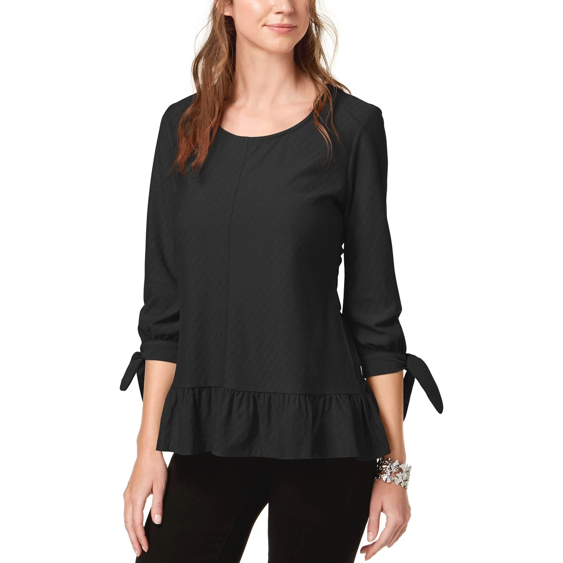 Pretty tie cuffs and a cute peplum hem add interest to this petite jacquard top from Style & Co. Features a scoop neckline, textured pattern, peplum hem, three-quarter sleeves and ties at cuffs. Loose fit; hits below hip. Due to generous sizing, we suggest sizing down for the perfect fit. Style: A100013060P.