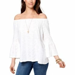 Eyelet embroidery throughout complements this off-the-shoulder, petite top from Style & Co. with a soft, classic theme, finished with three-quarter-length bell sleeves. Relaxed fit; hits below hip. Style: A100014391P.