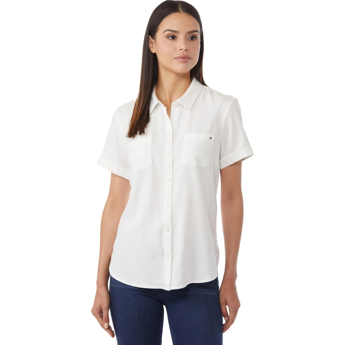 Tommy Hilfiger’s iconic short sleeve button front Campshirt features two front chest pockets, shirttail hemline and a breathable woven, linen fabric. Fabric is made of linen and rayon. Shirt is imported. A great way to stay cool and casual. Style: J2JA0488174.
