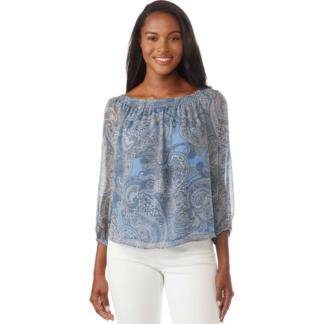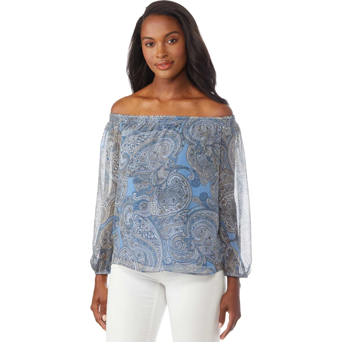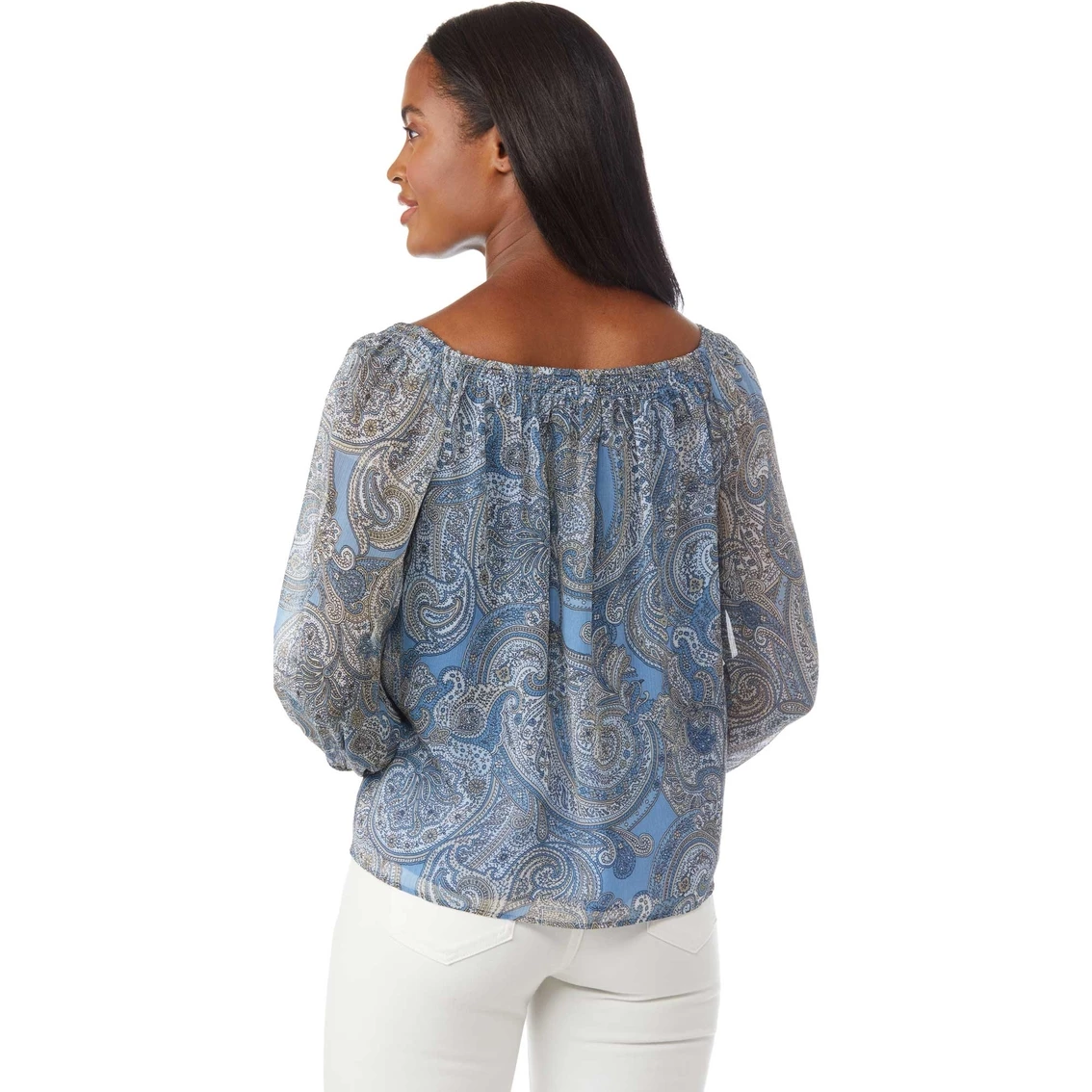 A classic paisley print with long sleeves makes this top a must have for a day at the office or even out on the town.