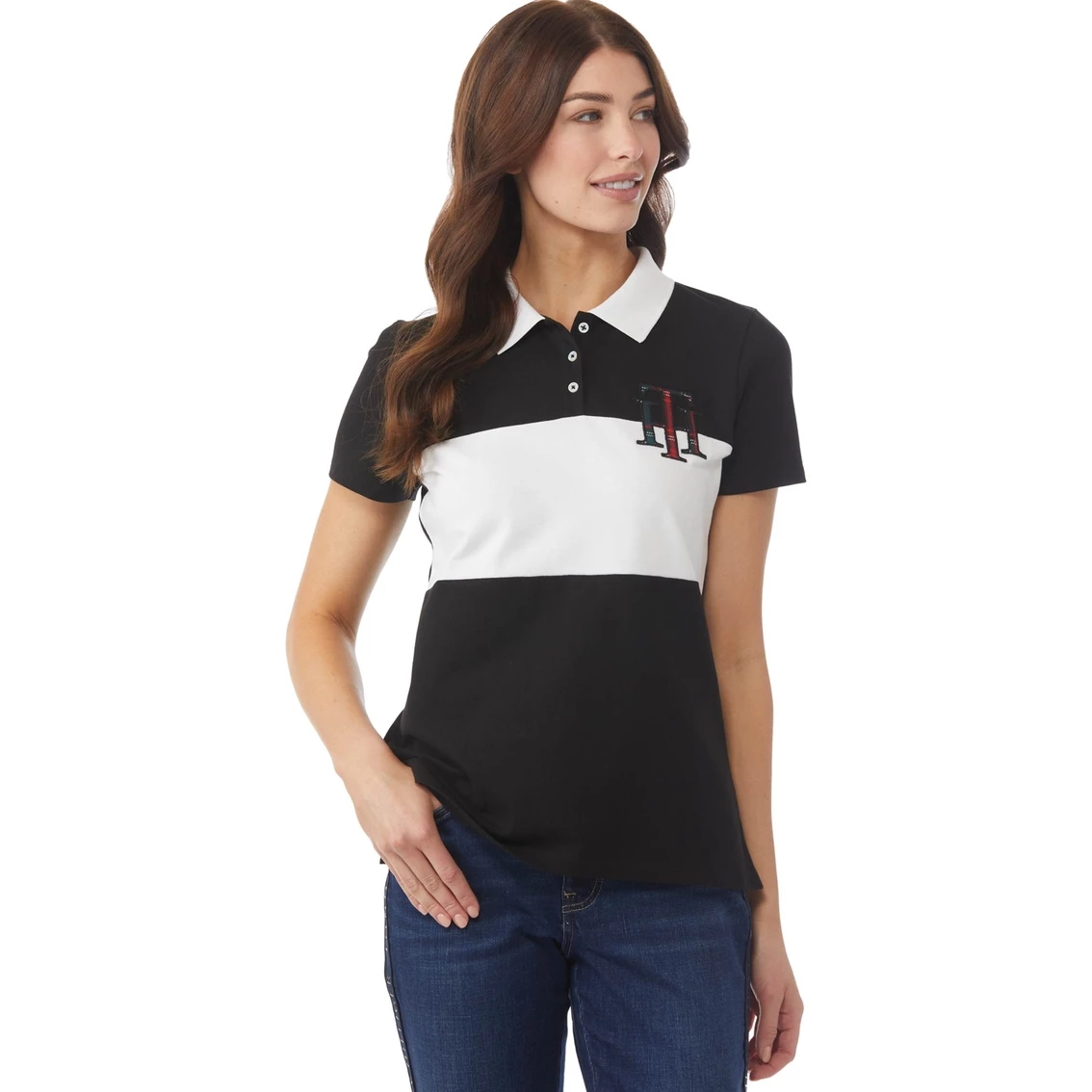 This best-selling short-sleeve polo shirt from Tommy Hilfiger is accented with a colorblocked collar and center stripe. It also has an exaggerated plaid logo at the chest. The women’s polo shirt is machine washable for easy care. Style: J2IH6827.