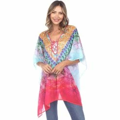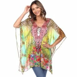 This flowing Animal Print Caftan from White Mark is perfectly accented on sheer fabric. This breezy tunic top features a rich multi print sprinkled with sparkle trims and crisscross tie-up neckline. Style: SK982700.