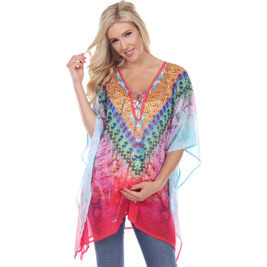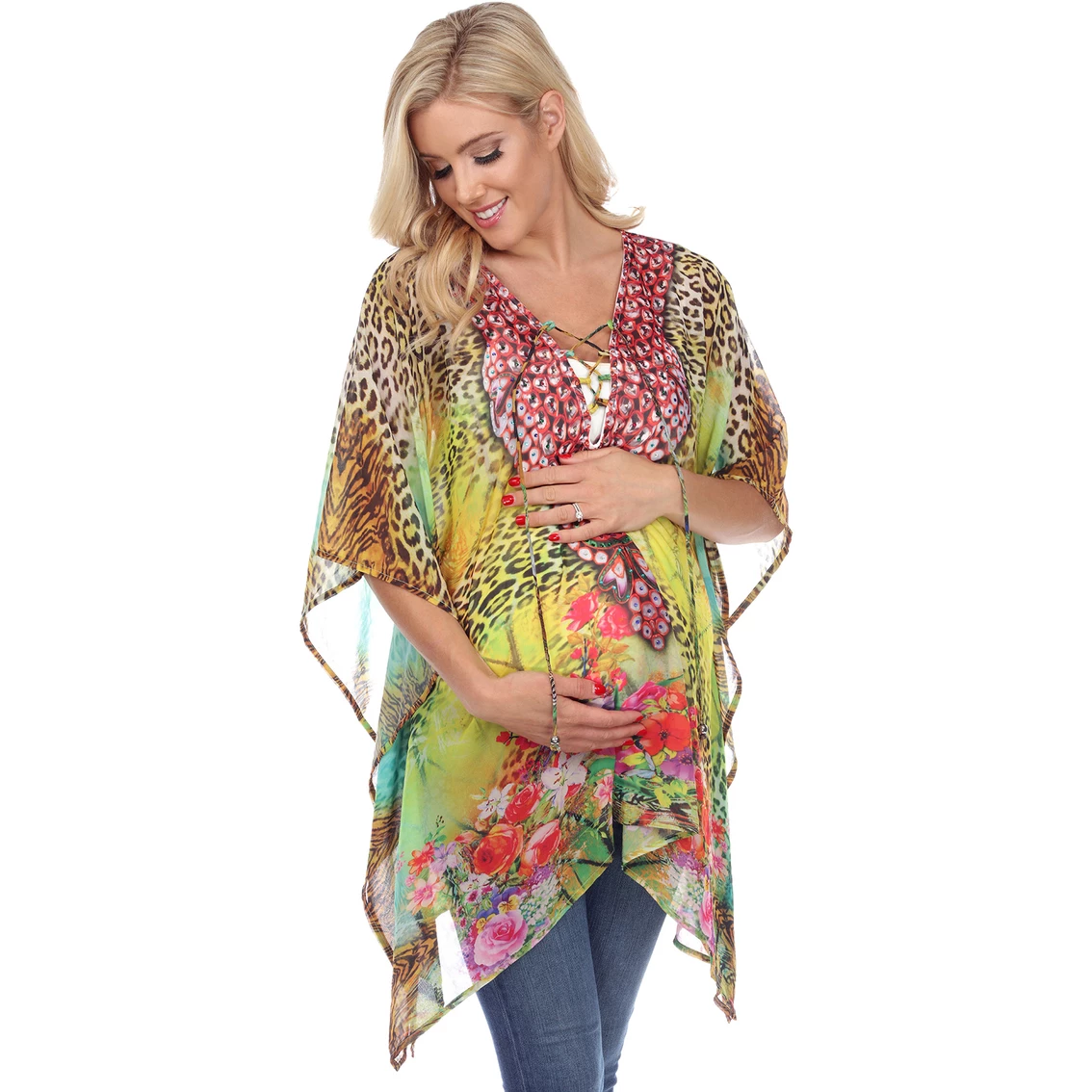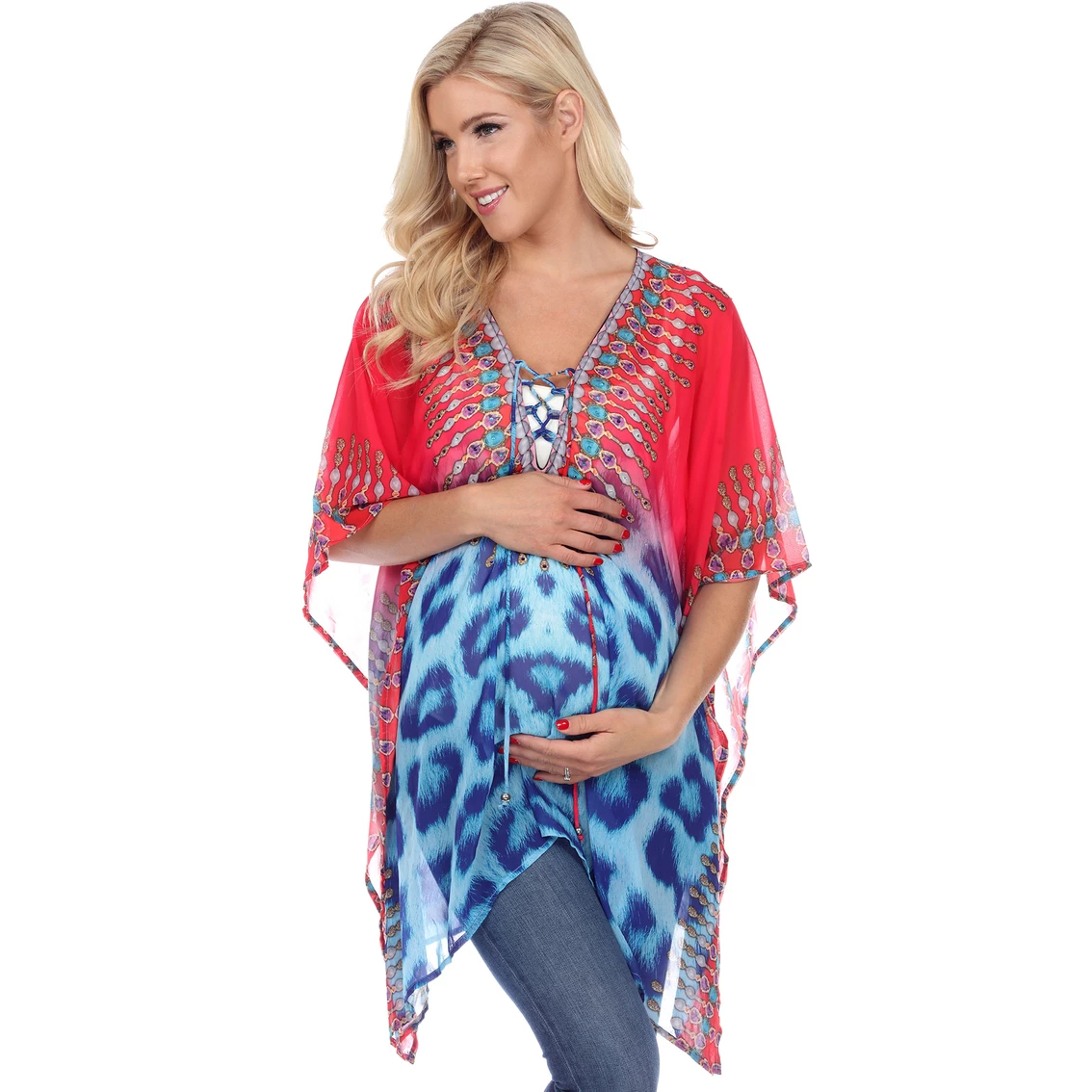 The White Mark Women’s Maternity Animal Print Caftan drapes stunningly over the body. This vibrant piece is made from a sheer fabric with embellished detailing at the neckline. It features a tie up V-neckline and long Kimono style sleeves. The caftan works as a pool cover up for the day and an evening top for those hot summer nights. Style: MTRPS982-106.