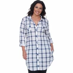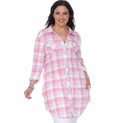 This button-front tunic from White Mark is soft and light and has an allover yarn-dyed stretchy plaid pattern. Long sleeves with buttoned cuffs roll and tab to three-quarter length. It is so versatile that you can wear it with shorts, leggings, jeans or even as a shirt dress. Style: PS17556.