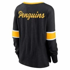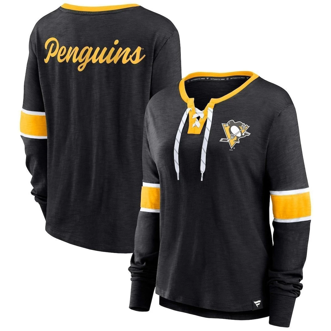 - Upgrade your rotation of official Pittsburgh Penguins apparel with this Effervescent Exclusive T-shirt from Fanatics Branded. It features a stylish notch neckline with a lace-up closure, as well as sewn-on stripes on the sleeves that are comprised of team colors. Every time someone sees the team’s logo on the front and additional team graphics on the back, they’ll know that you are the #1 supporter of the Pittsburgh Penguins.