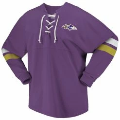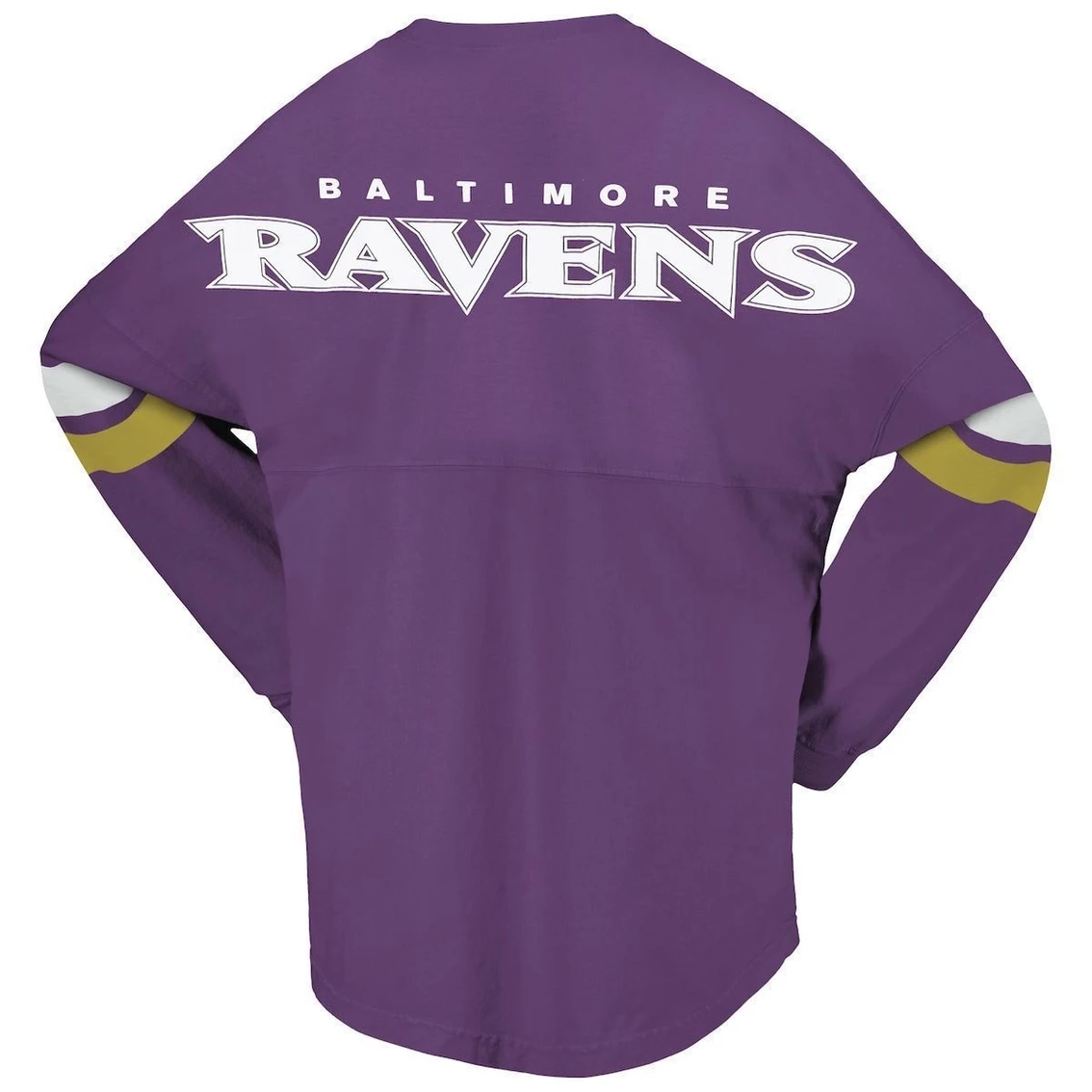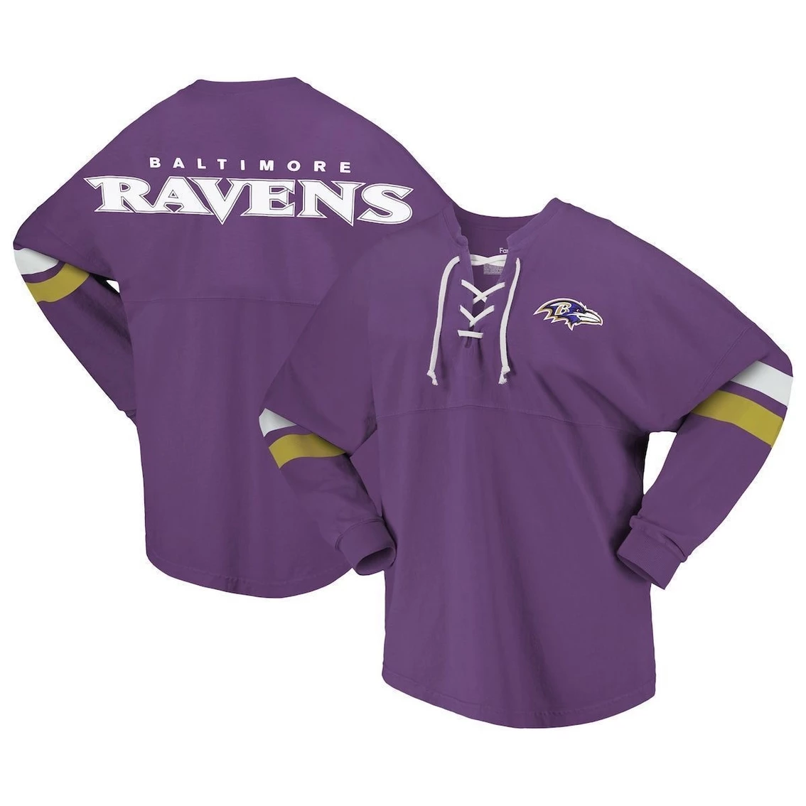 - Make a fashion statement on Baltimore Ravens game day in this Spirit Jersey V-neck T-shirt from Fanatics Branded. It features a sporty lace-up neckline and stripes in team colors that highlight the Baltimore Ravens graphics printed on the front and back. The longer, rounded hem also provides a more comfortable fit and feel.