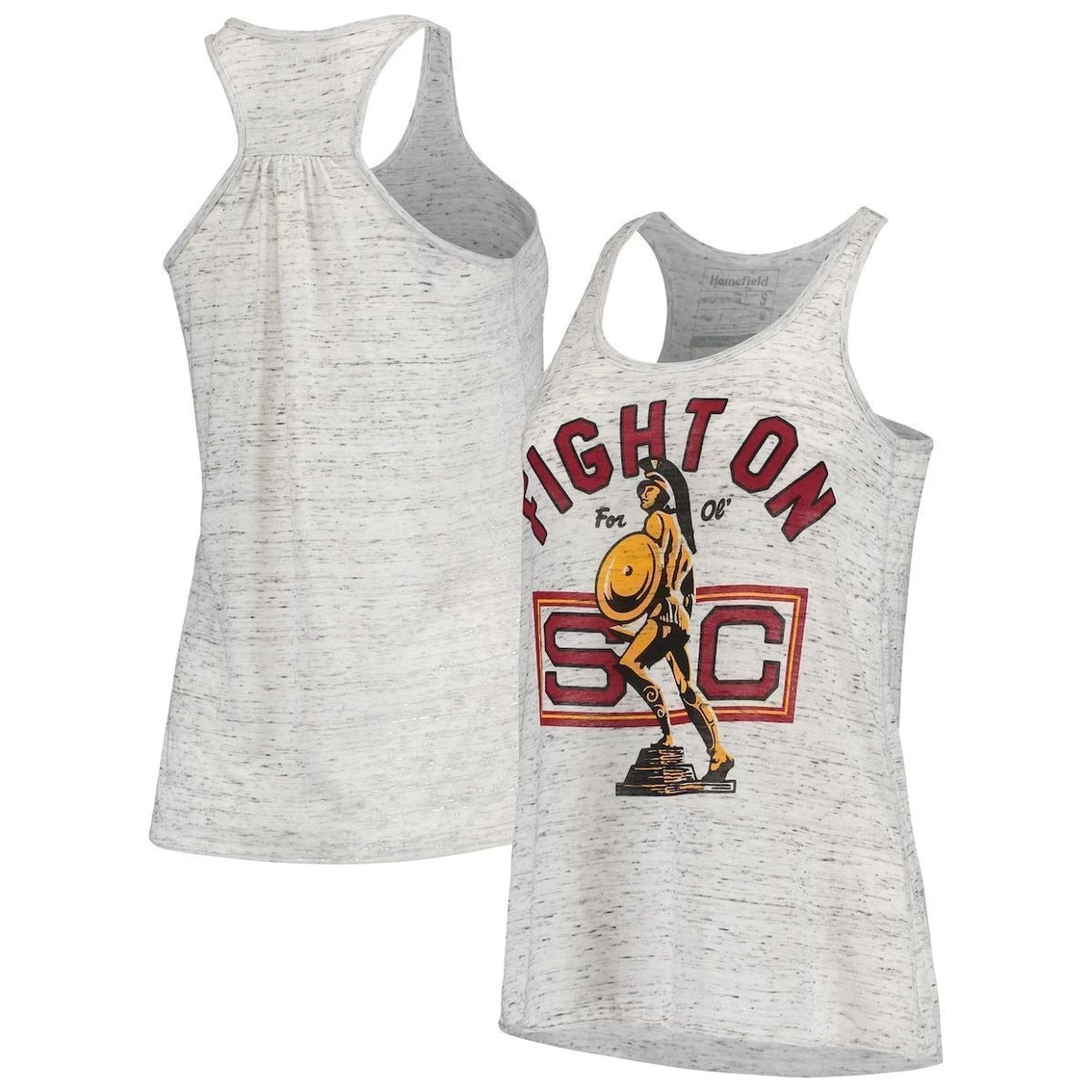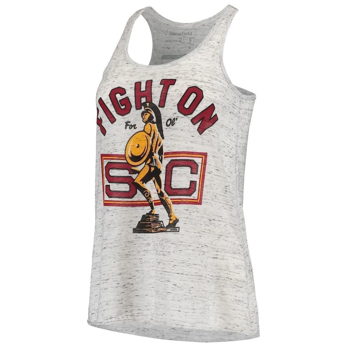 Use a throwback lens to show your school pride with this USC Trojans vintage racerback tank top from Homefield. The slub fabric and historic logo combine for a great look on top of incredibly soft material. The racerback design also adds stability without sacrificing mobility to ensure a premium fit. This tank is the perfect way to support the USC Trojans with both style and comfort in mind. SleevelessOfficially licensedTagless CollarMachine wash with garment inside out, tumble dry lowScreen print graphicsSlub fabricRacerbackSerged hemMaterial: 91% Polyester/9% CottonRounded droptail hemImportedScoop neckBrand: Homefield