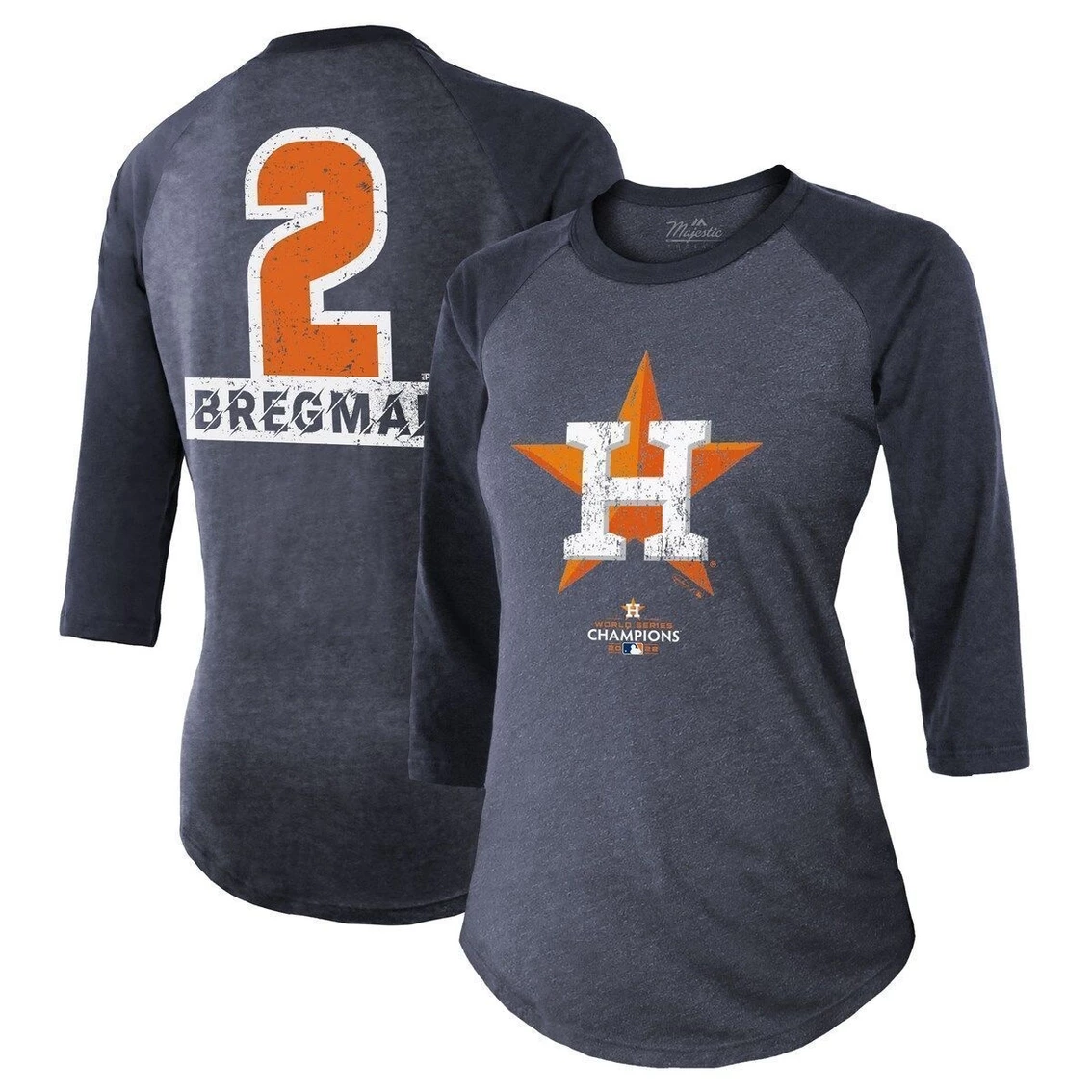 - With every pitch, hit and play, the Houston Astros made all the right moves to become the 2022 World Series Champions! Celebrate this victorious moment in Houston Astros history by grabbing this Alex Bregman Name & Number Softhand Raglan 3/4 Sleeve Tri-Blend T-Shirt from Majestic Threads. It features crisp graphics to commemorate this incredible postseason run and let everyone know that your team reigns supreme.