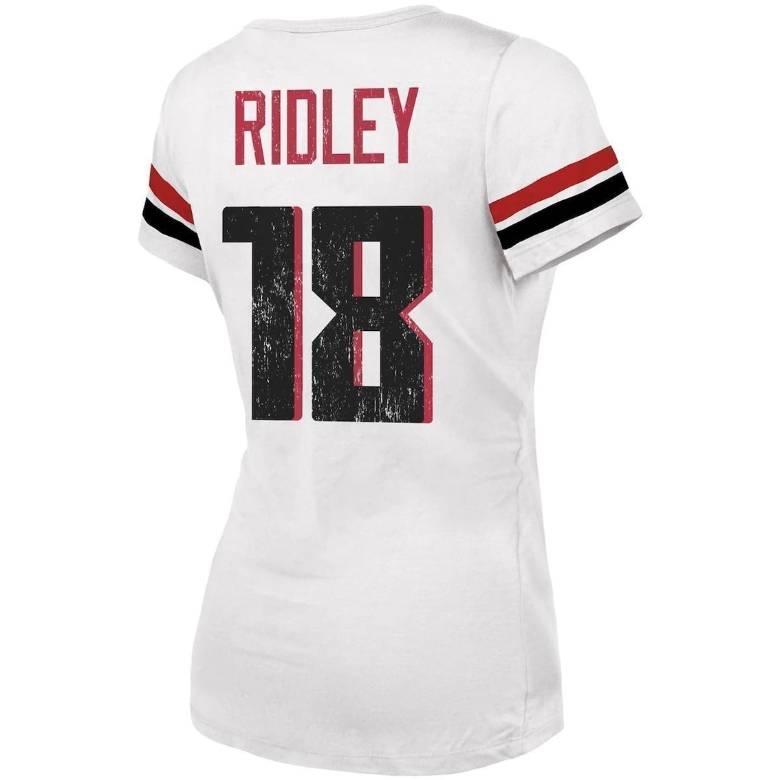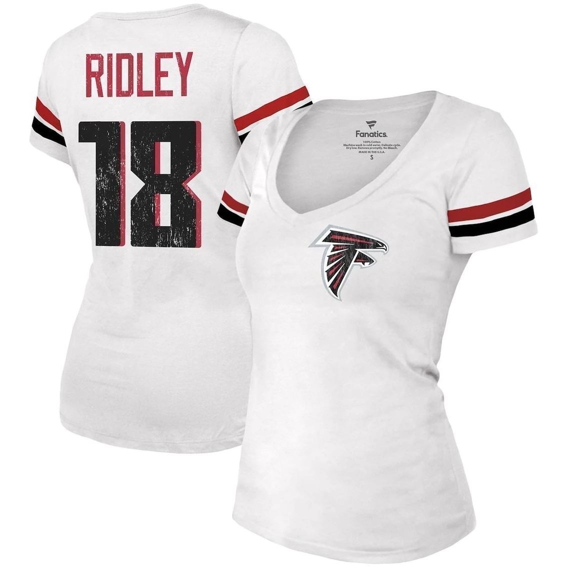 - Upgrade your Atlanta Falcons wardrobe with the help of this Calvin Ridley Player Name and Number V-neck T-shirt from Majestic Threads. This top’s distressed details offer an edgy take on the team logo, complete with contrast-color stripes to take your Atlanta Falcons spirit to fashionable new heights.