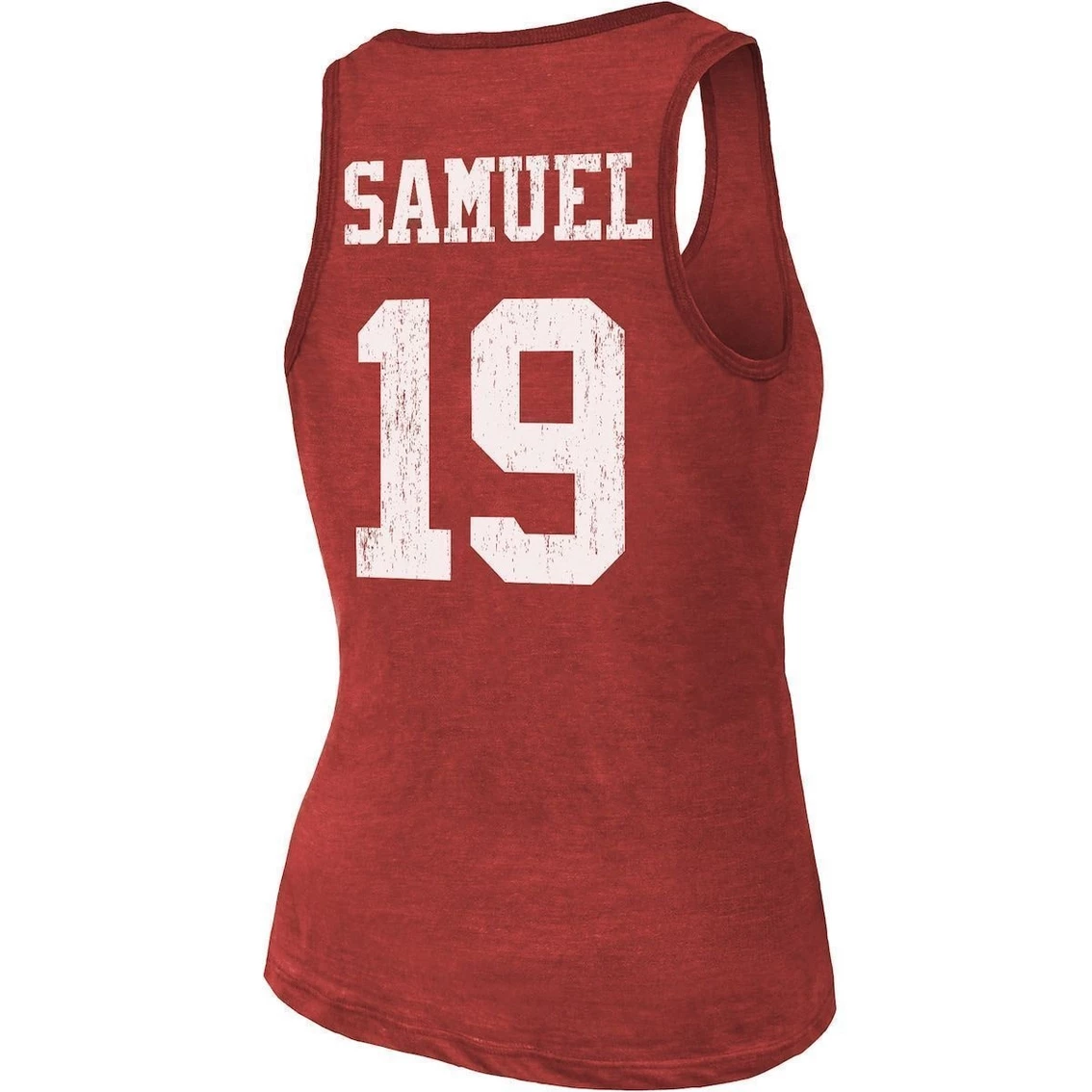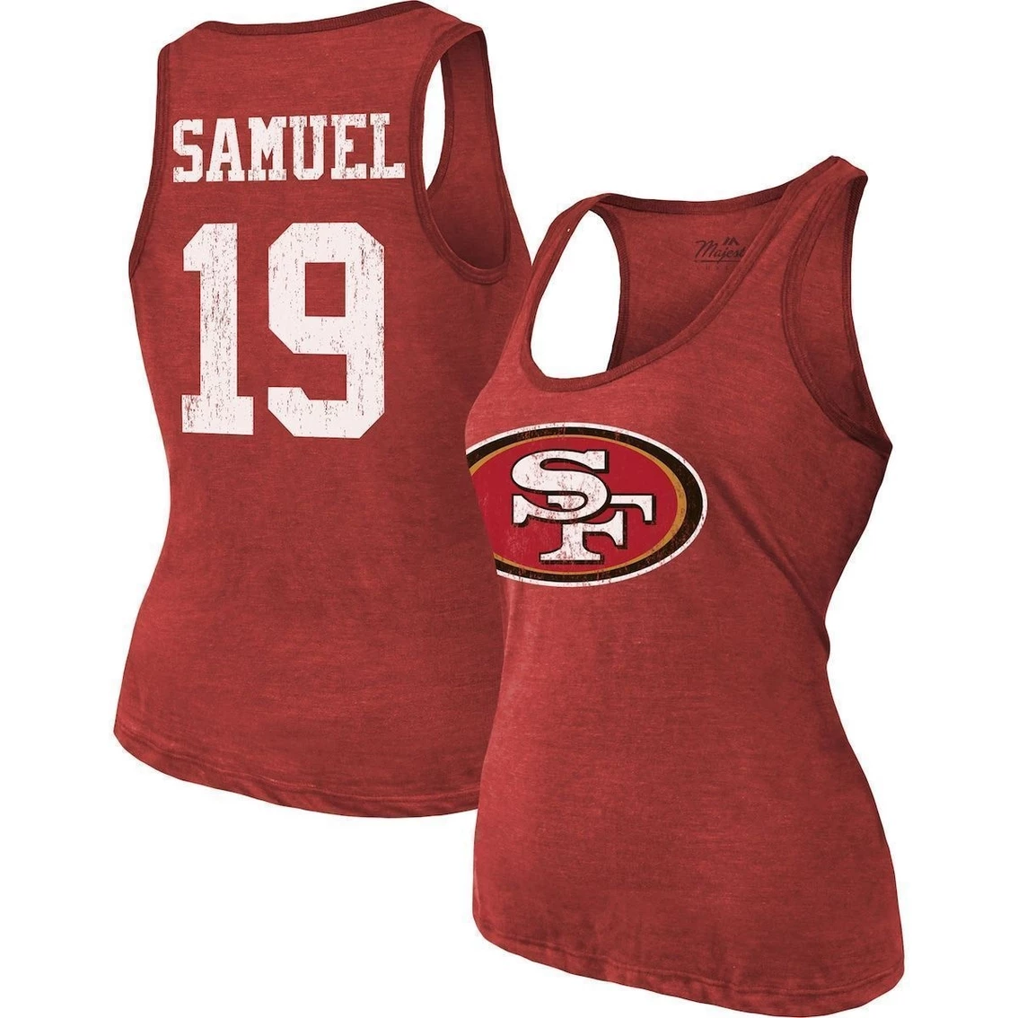- Though the NFL’s most meaningful games are in the fall and winter, your passion for the San Francisco 49ers doesn’t stop when the warm weather comes around. Enjoy those beautiful summer days while supporting your favorite team with this Deebo Samuel Player Name and Number tri-blend tank top from Majestic Threads. Its distressed San Francisco 49ers graphics are a perfect vintage touch while you bask in the sun.