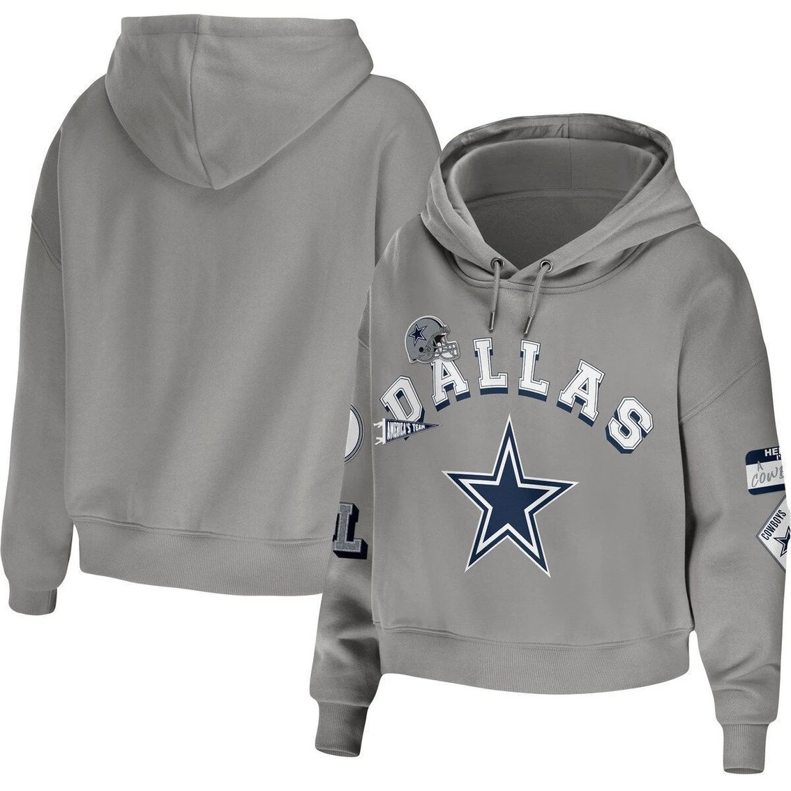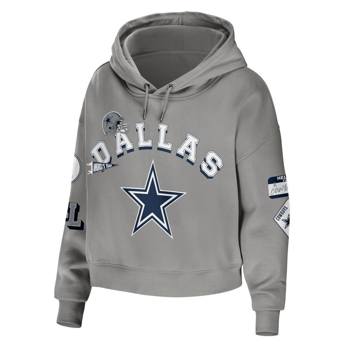 - Emphasize your unwavering Dallas Cowboys fandom by adding this Modest pullover hoodie from WEAR by Erin Andrews to your collection. It features several eye-catching team graphics on the front and along both sleeves. The cropped hem makes this midweight top the perfect option for representing the Dallas Cowboys in style.